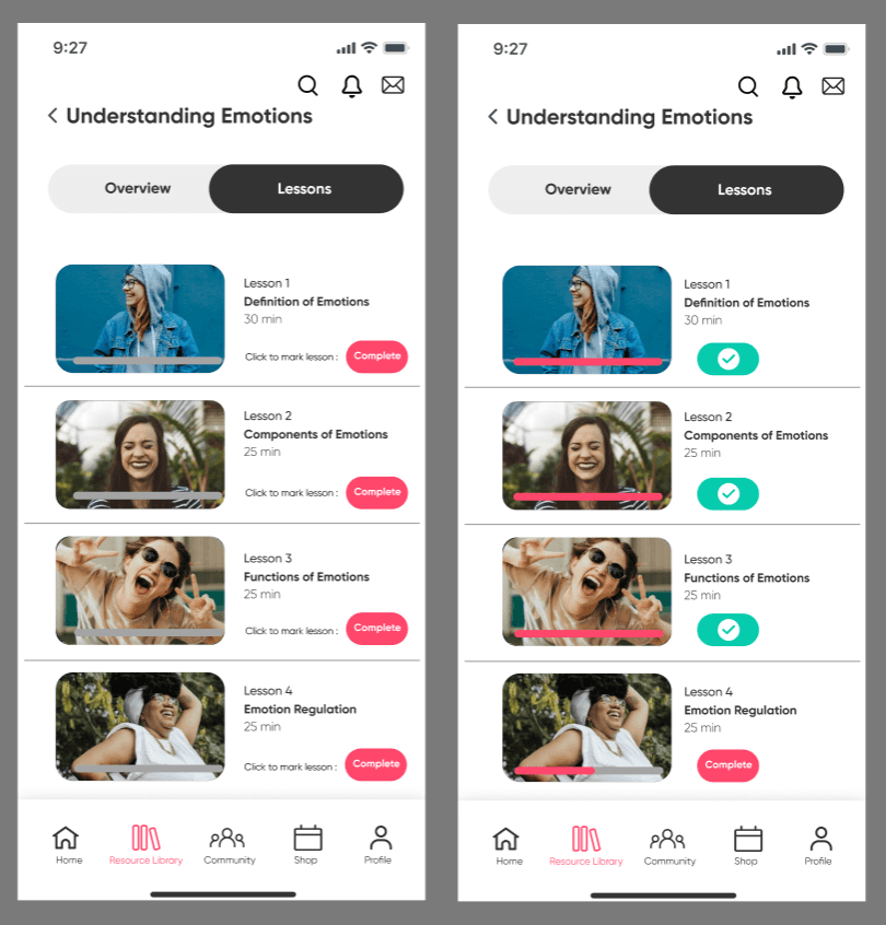 Original UI lacked opportunity for users to indicate to back end development that a video lesson has been completed.