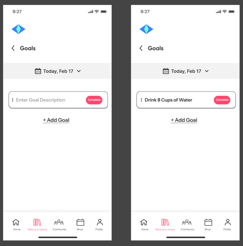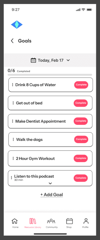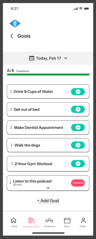 Prototyped action is revealed once the user marks the 6th goal as complete.